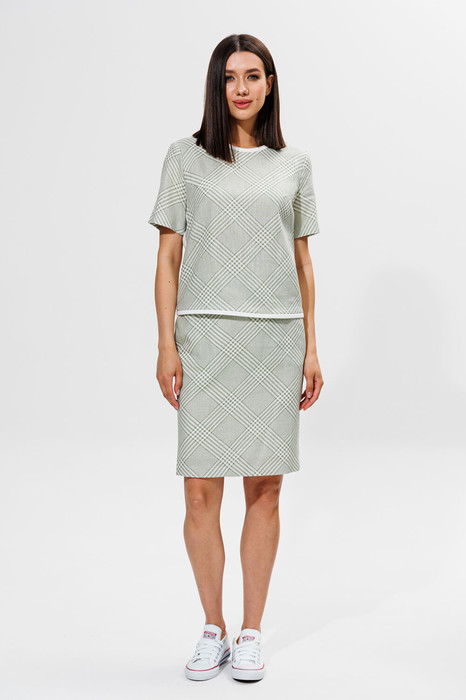 Классный юбочный комплект, состоящий из блузона полуприлегающего силуэта. По переду блузона нагрудные вытачки, притачная планка из отделочной ткани, шириной 1,2 см. Потрясающе подчёркивает изящество фигуры боковая вставка из отделочной ткани, шириной 2,7 см. Горловина переда блузона обработана притачной планкой из отделочной ткани, шириной 1,2 см. Спинка блузона с талевыми вытачками, располагающимися в горловине. По среднему шву спинки: металлическая разъёмная тесьма-молния. Горловина спинки обработана обтачкой. Длина блузона по спинке: р.44-48: 53,5 см; для р.50-52: 54,5 см. Рукав втачной, одношовный, длиной 24 см. Юбка блузона на кокетке с боковыми, функциональными, наклонными карманами. С боковой вставкой из отделочной ткани, шириной 2,7 см. По среднему шву юбки потайная застёжка-молния, внизу разрез. Верхний край юбки обработан обтачкой. Юбка на подкладке. Длина юбки по боковому шву: для р.44-48: 59,5 см; для р.50-52: 62 см. Цвет комплекта может отличаться на полутон от заявленного на фото.