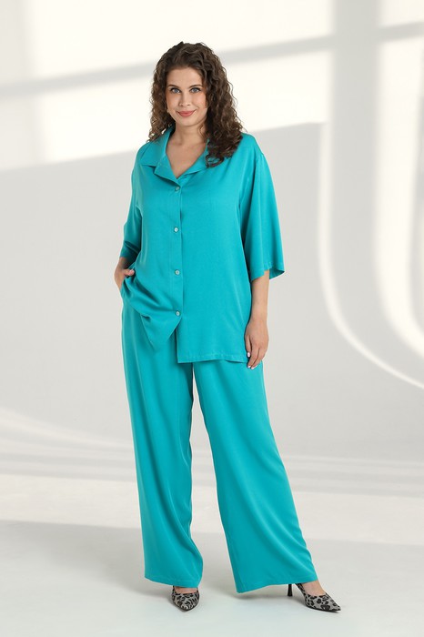 Костюм женский из гладкокрашеного тканого полотна «штапель» состоящий из блузы и брюк в единой цветовой гамме.