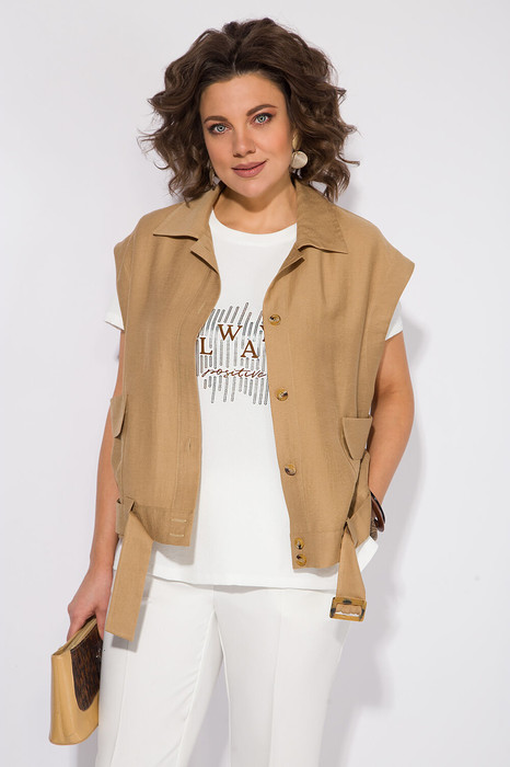 Эффектный и неординарный комплект, в стиле «casual». Модель состоит из свободной жилетки песочного оттенка и молочной футболки с печатью. Жилетка со спущенным плечевым швом; с отложным воротником. Застежка центральная на петли и пуговицы с планкой.  По полочке расположены накладные карманы с имитацией клапана. По низу предусмотрен съёмный пояс  с  декоративной пряжкой  в тон изделию. Спинка без особенностей. Футболка в комплекте с округлым вырезом горловины и боковыми разрезами по низу. Рукав вточной, укороченный.  Данный комплект отлично сочетается с различными элементами гардероба, подчеркивая ваш уникальный стиль и вкус. Подойдет в комплекте с базовыми брюками из коллекции от бренда LILIANA под арт. М-БрЛ!