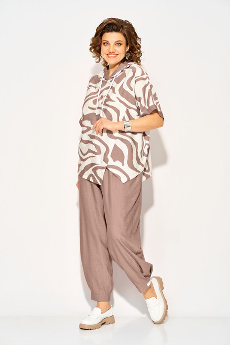 Стильный летний костюм, состоящий из удлиненной туники свободного покроя и брюк. Оригинальная туника из вискозы   добавлением льна. Модель с цельнокроеным укороченным рукавом и ассиметричным подрезом по полочке. Модель с легким капюшоном и кулисой на шнуровке. Низ изделия разноуровневый. Спинка цельная. В комплекте свободные брючки, завышенной посадки. Брюки на притачном поясе с круговой резинкой. Имеются боковые карманы. Низ с заложенными складками, что придает изделию более спортивный образ.
