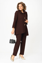 Модель свободного силуэта с отложным воротником на стойке. Застежка центральная на петли и пуговицы. Рукав на рубашечной пройме, длинный, низ оформлен манжетам. Полочка с ассиметричным накладным карманом с декором в виде молнии. Спинка на кокетке с заложенными складками на свободу движения. По бокам имеются карманы. В комплекте топ на спущенном цельнокроеном рукаве с округлым вырезом горловины. Лиф украшает печать накат в тон изделия.