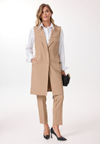 В комплекте классические женские брюки, со средней посадкой, прямого покроя от бедра. Застежка – брючная тесьма-молния с обработанным гульфиком. Карманы боковые. Пояс притачной, в боковых участках вставлена резинка на свободу. По переду заутюжены канты. Спинка с Талиевыми выточками. Подгибка брюк –– 4 см.