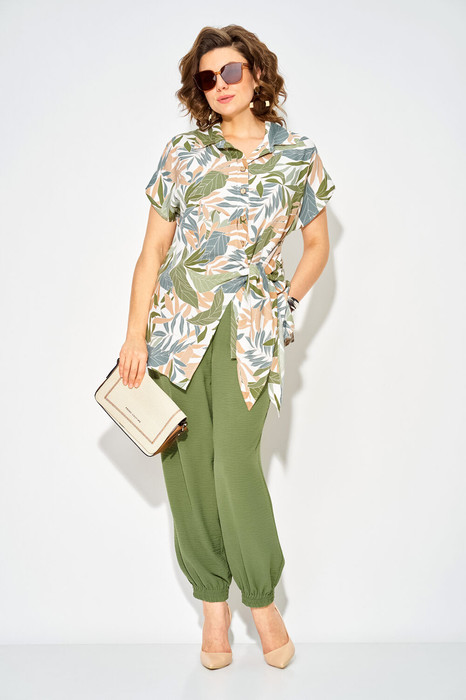 Стильный женский комплект для лета выполнен в современном стиле и отлично подходит для прогулки, отдыха дома или повседневных выходов. Образ состоит из двух частей: свободная хлопковая блузка и облегченные вискозные брюки «султанки». Блузка с тропическим принтом и ассиметричной декоративной завязкой по переду. Рукав цельнокроеный спущенный; воротник отложной на стойке, застежка центральная на пуговицы на притачной планке.