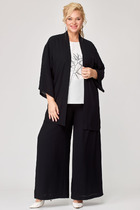 Шифоновое платье свободного силуэта на трикотажной подкладке. Горловина овальной формы. Платье отрезное чуть выше линии талии, на сборке. Рукав втачной. Низ рукава собран на эластичную тесьму. Жилет с нагрудными вытачками, отложными лацканами и двубортной застёжкой на петли и пуговицы. Спинка жилета с отлетной деталью. По низу жилета располагаются шлёвки с продетым в них съёмным поясом. Жилет на подкладке.