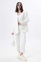 Двубортный жакет прямого силуэта с отрезным бочком в котором обработаны карманы, пиджачный воротник, спинка со средним швом, втачные двухшовные рукава, жакет на подкладке. Брюки зауженные к низу. На передних половинках брюк боковые карманы «хулиганы». Верхний срез брюк на притачном поясе на резинке с тесьмой.