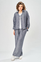 Комплект выполнен из хлопкового джинса. Куртка прямого силуэта, со спущенной линией плеча. Спереди центральная застежка на петли и пуговицы, по передним половинкам накладные карманы. Воротник стояче отложной. Низ рукава на притачной манжете, с застёжкой на петлю и пуговицу. По низу куртки вставлен шнур. Куртка без подкладки. Брюки на притачном поясе, на резинке, заужены к низу. Застежка брюк спереди по типу «гульфик». По бокам карманы с наклонным входом. Сзади накладные карманы.