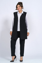 Костюм выполнен из крэш бархата. Блуза свободного силуэта. Горловина округлой формы обработана обтачкой. Рукав втачной, расклешённый к низу. По переду блузы нагрудные выточки, по боковым швам разрезы. Брюки прямого силуэта. Верх брюк на притачном поясе с эластичной тесьмой. В боковых швах карманы с наклонным входом.