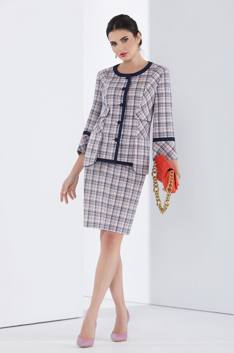 Жакет с округлым вырезом горловины, фигурным низом и центральной застёжкой на петли и пуговицы. Перед с декоративными деталями по низу и клапанами. Спинка со средним швом и талиевыми вытачками. Рукава втачные с отрезными деталями по низу. Жакет на подкладке.