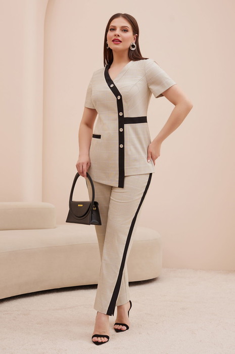Брюки на поясе с резинкой, со вставками из контрастной ткани по боковым швам и разрезами в нижней части боковых швов.