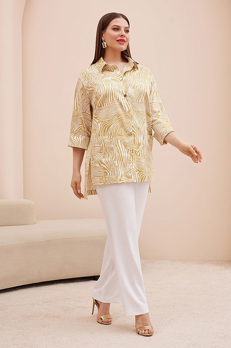 Рубашка прямого силуэта свободного кроя с центральной застежкой и настрочными карманами выполнена из гладкой х/б ткани с матовым блеском и актуальным принтом . Стильный акцент на золотые пуговицы завершает весь образ. Спинка удлиненная с горизонтальной кокеткой и встречной складкой, по бокам разрезы. Линия плеча приспущена, рукав с отложной манжетой с отворотом.