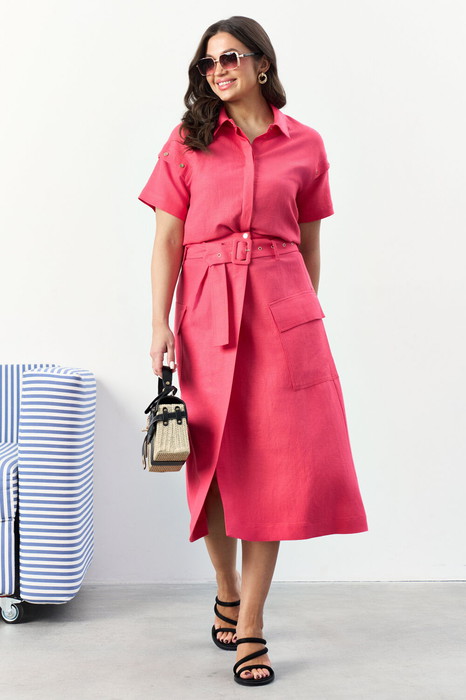 Юбка на притачном поясе и со съёмным поясом из основной ткани по талии. Изделие с застёжкой на кнопки и потайные пуговицы по переду в верхней части. Переднее полотнище с накладными карманами с клапанами. Заднее полотнище с кокеткой и средним швом.