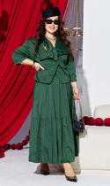 Жакет с воротником пиджачного типа и центральной застёжкой на петли и пуговицы. Перед с карманами с клапанами в нижней части и листочкой в верхней. Спинка со средним швом и двумя рельефами. Рукава втачные с пуговицами по низу. Жакет на подкладке. По локтевому шву рукава и боковому шву жакета идёт декоративный кант. Листочка со съёмной деталью в цвет канта.