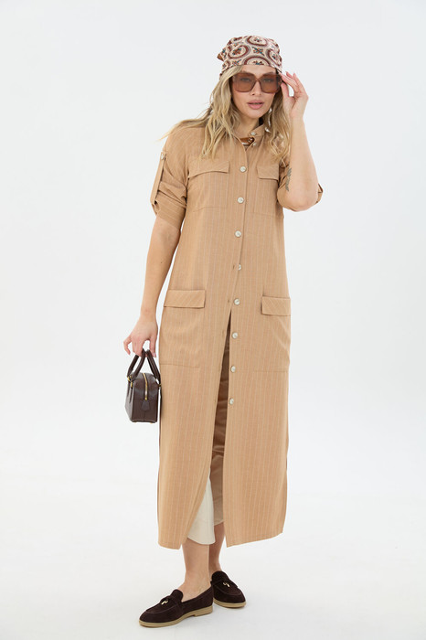 Комплект 2ка, состоящий из платья и брюк. Платье длины макси из  с застёжкой на пуговицы и разрезами по бокам. По переду две пары накладных кармана, горловина – стойка. Рукава платья дополнены шлейкой с застёжкой на пуговицу для сборки, на плечах стильные разрезы. Удобные повседневные брюки из лёгкой натуральной ткани. Брюки свободного прилегания по бедрам и зауженные к низу. Пояс на эластичной тесьме с кулисой и втянутым шнурком. Вход в карман фигурный, наклонный к боковому шву.
