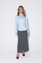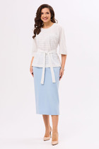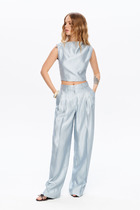 Костюм 2ка, состоящий из жилета и брюк. Удлиненный приталеный жилет с отложным вортником и лацканами. Застёжка центральная на пуговицу и петлю. По бокам выполнена имитация карманов с калапанами. Нижняя часть жилета состоит из двух слоёв: верхний -из лёгкой шифоновой ткани со стразами, нижний- из основной ткани . Длина по спинке 83-85 см. Брюки свободного прилегания по бедрам и зауженные к низу. Пояс на эластичной тесьме с кулисой и втянутым шнурком. Вход в карман фигурный, наклонный к боковому шву.