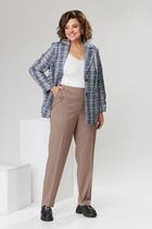 Комплект 2ка, состоящий из рубашки и брюк. Рубашка женская большого объема, прямого силуэта. На детали спинки расположена двойная кокетка, переходящая на деталь полочки. Под кокеткой на спинке встречная складка. Воротник рубашечный отложной на стойке. Застежка планка центральная на прорезные петли и пуговицы. Линия плеча спущенная, рукав рубашечный, длинный. В нижней части рукава заложены складки, заканчивается манжетой с двумя прорезными петлями и пуговицами. Низ блузки разноуровневый: спереди короче, сзади длиннее. Зауженные брюки с подворотами по низу. Пояс на эластичной тесьме с кулисой и втянутым шнурком. Вход в карман фигурный, наклонный к боковому шву.