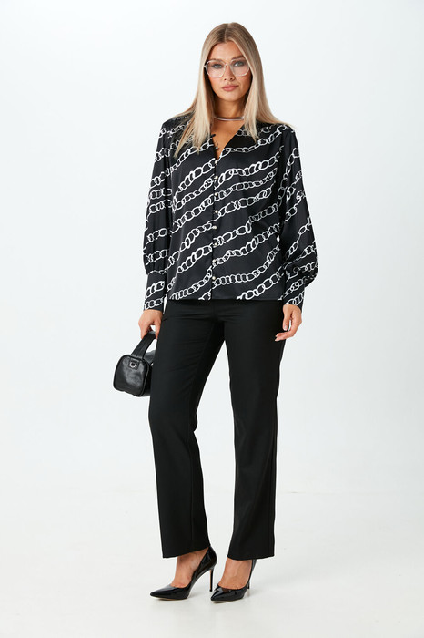 Комплект 2ка, состоящий из блузки и брюк. Блуза из тонкой ткани с атласным эффектом, свободного силуэта с V-образным вырезом. Это довольно глубокий вырез, который прекрасно подчёркивает декольте и линию шеи. Застежка на навесные петли и пуговицы. Рукава длинные объёмные втачные заканчиваются широкой манжетой с застёжкой на навесные петли с пуговицами.  Брюки малого объема, прямого силуэта. На передних половинках с обеих сторон расположены под наклоном нефункциональные прорезные карманы в рамку. На задних половинках расположены вытачки. Пояс отрезной. На поясе расположены шлевки. Застежка брюк – гульфик на молнии, на поясе крючок. Длина блузки 67 см, длина брюк 110-112 см.