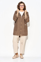 Комплект 2ка, состоящий из блузки и брюк. Блуза из тонкой ткани с атласным эффектом, свободного силуэта с V-образным вырезом. Это довольно глубокий вырез, который прекрасно подчёркивает декольте и линию шеи. Застежка на навесные петли и пуговицы. Рукава длинные объёмные втачные заканчиваются широкой манжетой с застёжкой на навесные петли с пуговицами. Брюки малого объема, прямого силуэта. На передних половинках с обеих сторон расположены под наклоном нефункциональные прорезные карманы в рамку. На задних половинках расположены вытачки. Пояс отрезной. На поясе расположены шлевки. Застежка брюк – гульфик на молнии, на поясе крючок. Длина блузки 67 см, длина брюк 110-112 см.