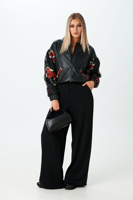 Бомбер из экокожи с объёмными рукавами и застёжкой на молнию. Манжеты и низ бомбера на резинке. Карманы и рукава бомбера декорированы сеткой с цветочной вышивкой.