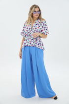 Комплект 2-ка, состоящий из лёгкой туники и брюк. Туника свободного силуэта с V-образным вырезом горловины. Рукав блузки цельнокроеный. Ниже линии груди вставлена эластичная резинка. Брюки широкого объема. По центру переда заложены две широкие встречные складки на каждой половинке. В боковых швах расположены карманы с наклонным входом. Пояс на резинке.