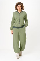 Комплект 2ка, состоящий из джемпера и брюк. Джемпер свободного объёма из стёганой ткани. Горловина на молнии с окантовкой из экокожи. Манжеты и низ джемпера на резинке. По бокам расположены карманы.Брюки прямого силуэта свободного объёма. Застёжка на молнию и пуговицу. Вдоль боковых швов расположены лампасы из экокожи. Пояс и задние накладные карманы также выполнены из экокожи.
