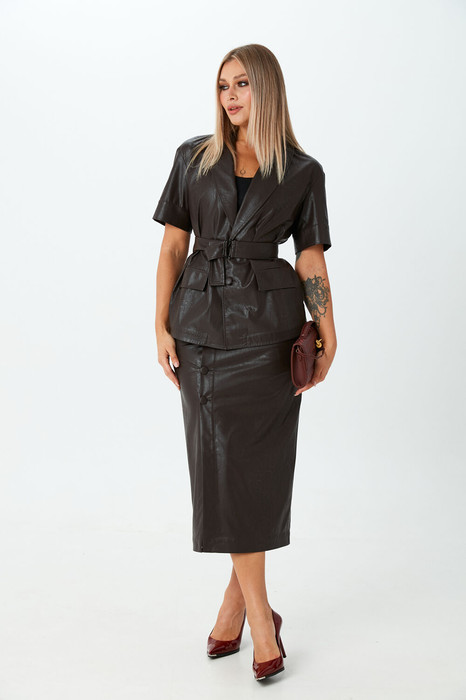Комплект 2ка, состоящий из жакета и юбки. Жакет из экокожи на вискозе с короткими рукавами, без подкладки. Застёжка на пуговицы по центру. По переду имитация карманов с клапанами. В комплекте идёт пояс с пряжкой. Юбка-карандаш из экокожи длины ниже колена, на подкладке. По переду юбка расположена застёжка на пуговицы. По бокам карманы.