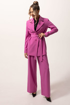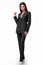 Двубортный жакет умеренного объема, полуприлегающего силуэта. Карманы прорезные, в рамку с клапаном. Спинка имеет плечевые вытачки, средний шов со шлицей. Рукава двухшовные, длинные. Воротник – стойка, переходящая в край борта, имеющий V-образную форму. Застежка на прорезные петли и пуговицы. Жакет полностью обработан притачной подкладкой. Длина изделия до середины бедра. Длина по спинке 71 см, длина рукава 61 см. Брюки умеренного объема, прямого силуэта. На передних половинках брюк заутюжены стрелки, переходящие в складки по линии талии. На задних половинках также заутюжены стрелки. В боковых швах расположены карманы. Застежка-гульфик. Пояс отрезной, притачной. В задней части пояса вставлена эластичная тесьма (резинка). На пояс настрочены шлевки. Выступающая часть пояса застегивается на петлю и крючок. Длина брюк в пол 114 см, ширина по низу 27-34 см в зависимости от размера. Фурнитура и материалы отделки могут незначительно отличаться от тех, что на фотографии.