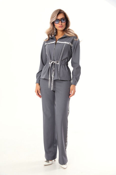 Костюм 2ка, состоящий из рубашки и брюк.   Рубашка с застёжкой на молнию и воротником - стойкой. По талии рубашки расположена кулиса и шнурок для приталивания. Декоративные элементы по переду рубашки и шнурок выполнены из велюра. Манжеты на пуговицах. Брюки прямого силуэта на эластичной резинке по талии. По переду расположены карманы с наклонным входом.