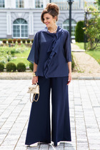 Костюм брючный состоит из блузы и брюк. Блуза из натуральной вискозы на хлопковой подкладке. Блуза без рукавов, воротник пиджачного типа, застёжка на петли и пуговицы. По всей линии талии резинка, низ блузы на сборке и обработан подкладкой. Брюки прямого силуэта, заутюженные на кант. По линии талии притачной пояс, застёжка на молнию и петлю-пуговицу. В боковых швах прорезные карманы.
