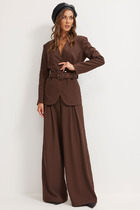 Элегантный комплект из  удлиненного жилета и широких стильных брюк. Комплект выполнен из мягкой костюмной ткани. Однобортный жилет полуприлегающего силуэта с отложным воротником, на подкладке,  с центральной застежкой на пришивные  потайные кнопки.  Воротник отложной. Жилет дополнен удобными карманами.  Притален за счет съемного пояса, выполненного из основной ткани (в комплекте). Широкие брюки прямого кроя с притачным поясом, с застежкой на пришивную пуговицу и молнию. Посадка слегка завышена. Дополнены функциональными боковыми карманами.Длина жилета от плечевого шва 87 см. Длина брюк по боковому шву 109 см