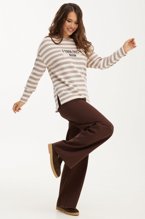 Стильный и комфортный комплект из  джемпера и брюк. Джемпер свободного кроя, рукав слегка спущен. Горловина с округлым вырезом, обработанным довязом. По груди джемпер дополнен термо аппликацией. Джемпер выполнен из приятного к телу трикотажного полотна с эффектом ангоры  средней плотности. Брюки  прямого кроя  с притачным поясом, дополненным эластичной тесьмой.  Выполнены из комфортной костюмной ткани средней плотности. Застежка  гульфик на молнию и пуговицу. Брюки дополнены удобными боковыми карманами, а так же накладными задними. Длина джемпера от плечевого шва 65 см. Длина рукава 59 см. Длина брюк по боковому шву 106см.
