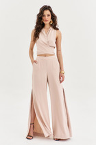 Стильный трикотажный костюм  из джемпера и юбки. Выполнен из качественного,  приятного к телу  трикотажного полотна. Джемпер прямого свободного кроя. Рукав втачной, слегка спущен, дополнен притачной манжетой. Горловина -стойка цельнокроеная. Перед  джемпера выполнен из коричневого трикотажа, спинка - из черного. Спереди джемпер дополнен притачной планкой с кулиской по низу. Юбка миди с боковым разрезом. По талии эластичная тесьма. Выполнена из черного трикотажа. Юбка дополнена из комфортной трикотажной подкладкой.  Длина джемпера от плечевого шва 63см. Длина рукава60см. Длина юбки85см.