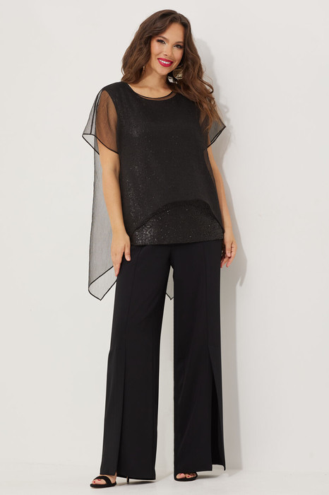 Нарядный комплект из блузы, топа и брюк. Блуза свободного кроя. Выполнена из воздушной невесомой органзы. Оригинальный дизайн придает образу изящности. Топ прямого кроя. Выполнен из ткани в пайетки, что создает эффект легкого мерцания. Брюки классического прямого кроя с притачным поясом, дополненным эластичной тесьмой. Спереди брюки дополнены разрезами(шлица). По бокам расположены удобные карманы. Длина блузы от плечевого шва по переду 62см., по спинке 88см. Длина топа от плечевого шва 69см. Длина брюк 111см.
