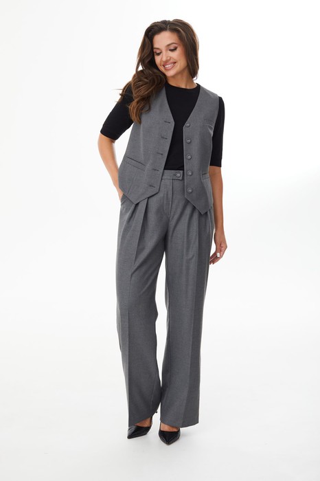 Костюм женский, состоящий из жилета и брюк. Жилет полуприлегающего силуэта на полной подкладке и застежкой на пуговицы. По переду прорезной карман, сзади - хлястик с застежкой на 2 пуговицы. Брюки свободного силуэта с косыми карманами. Пояс брюк прямой, из пояса по переду с каждой стороны от гульфика по две складки. Застежка на пуговицы и молнию.