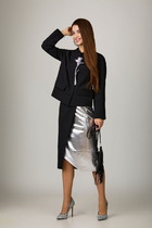 Универсальный и удобный женский брючный костюм из мягкой костюмной ткани предназначен для повседневной носки и торжественных мероприятий. Жакет укороченный с цельнокроенным рукавом длиной 7/8 с патой, закрепленной пуговицей. Перед жакета с ассиметричной косой застежкой на навесные петли с пуговицами. В качестве декора горловина и край борта передних полочек отделан вставкой из экокожи в цвет основной ткани. Брюки-шаровары длиной 7/8, по верху с поясом на резинке. Имеются боковые карманы в швах. Также по талии( переда) двухвстречные складки, по низу передних и задних половинок односторонние складки, придающие пышность брюкам. Комплект смело сочетается с любой обувью. Длина жакета по спинке 56 см+-1 см, длина рукава от горловины 50 см ± 1см. Длина брюк по боковому шву 99 см+-1см, по шаговому 66 см+-1см. Изделие подойдет на рост 170 см.