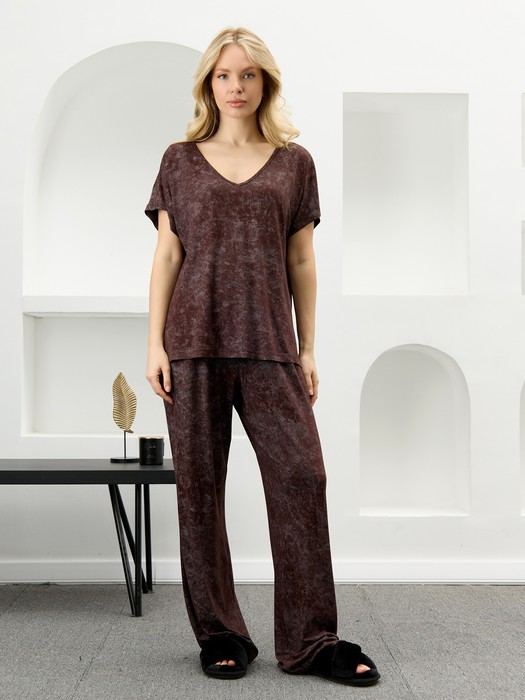 Костюм женский в комбинации двух видов полотен: из гладкокрашенного трикотажного вискозного полотна с эффектом «варенка», состоящий из футболки и брюк. Футболка - свободного покроя, с короткими цельнокроеными рукавами, горловиной V-образной формы, окантованной основным материалом и разрезами в боковых швах. Модной деталью является разница длин между полочкой и спинкой.Брюки – длинные, свободные, на притачном поясе с эластичной тесьмой внутри.