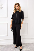 Повседневный комплект, состоит из платья и накидки. Платье полу-прилегающего силуэта, выполнено из трикотажного полотна в полоску, хорошо тянется. Горловина округлой формы, окантована, рукав укороченный, спинка идентична полочке. Накидка представляет собой удлиненную блузу, выполнена из штапеля и сетки. Горловина обработана воротником на стойке, застежка на планку с пуговицами. По линии талии отрезная, с вставкой из кружева и нижняя часть блузы выполнена из сетки, низ обработан широкой планкой из штапеля. Рукав втачной, укороченный, спинка идентична полочке. Универсальный и многофункциональный комплект прекрасно может сочетаться с другими вещами вашего гардероба.