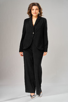 Вечерний брючный костюм больших размеров, состоящий из свободной блузки и классических брюк. Этот брючный, вечерний костюм подходит для женщин, которые ищут удобную и стильную одежду для свадьбы, на юбилей, на выпускной, на торжество, на корпоратив. Выполнен из текстиля, блуза свободного покроя, горловина округлой форме обтачке. По переду выполнены вертикальные подрезы, один край декорирован стразами, вертикальные линии прекрасно вытягивает силуэт и делает фигуру изящнее. Рукав втачной, оптимальной длины. Брюки с высокой посадкой визуально стройнят фигуру и идеально подходят для полных женщин. Верхний срез обработан поясом на резинке.  Яркость ткани добавляют наряду для женщин праздничный вид, а весенние оттенки создадут праздничное настроение. Благодаря свободному крою, он обеспечит комфорт и свободу движений.