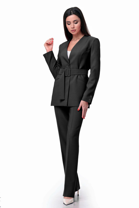 Костюм двухпредметный состоит из жакета и брюк.  Элегантный дизайн костюма  с брюками подарит комфорт и уверенность в себе. Жакет с центральной застежкой на 2 петли и пуговицы с прорезными функциональными карманами по переду. Рукав втачной двухшовный со шлицей декорированной пуговицами. Брюки прямые от линии калена, застежкой в боковом шве на потайную молнию. В комплект входит пояс с пряжкой. Костюм двойка отлично подойдет для офиса, для праздника, на каждый день для прогулок.  Длина жакета 69 см, длина брюк 110 см