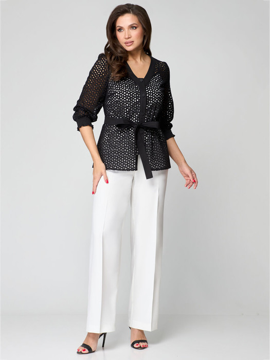 Безупречный, молодежный комплект, состоящий из блузы, топа и брюк. Нарядный образ, в котором будешь нежной и легкой. Топ полуприлегающего силуэта, выполнен с окантовкой из контрастной отделочной  ткани. Брюки прямые, широкие, с поясом. В боковых швах  имитация карманов. Застежка гульфик с молнией и пуговицей. Блуза выполнена из полотна  ришелье (хлопок 100%), прямого силуэта. Рукав втачной, слегка объемный по низу, с манжетой, присборенной на «венгерку».  Горловина  V-ой формы. По переду -  планка  с застежкой на петли –пуговицы, не доходит до низа изделия на 9 см, выполнена, как и горловина изделия, из хлопковой отделочной ткани.  В комплект входит съемный пояс.