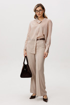 Элегантный женский комплект прямого силуэта из легкой струящейся ткани.Туника  прямого силуэта. Перед состоит из нижней детали и с боковым подрезом и шлицей с левой стороны, нагрудные вытачки идут от плечевого среза. Верхняя деталь переда   ассиметричной формы. Спинка со средним швом и застежкой на потайную тесьму-молнию. Округлый вырез горловины. Рукав втачной одношовный . Брюки прямого силуэта пояс на резинке, с посадкой на талии ,  с боковыми наклонными карманами на передних половинках брюк . По передним  половинкам брюк заутюжены стрелки. Для лучшего прилегания брюк в области талии в поясе со стороны спинки вставлена резинка