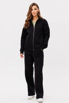 Комплект, состоящий из жакета и юбки. Жакет полуприлегающего силуэта выполнен из трикотажного полотна . По переду жакета настрочены карманы обманки с листочкой с декоративной тесьмой и пуговицей. Так же декоративная тесьма по горловине переда. Рукав втачной двухшовный. Спинка со средним швом и талиевыми вытачками. Застегивается жакет на 4 пуговицы и петли. Жакет без подкладки. Длина рукава- 20,5 см, длина по спинке-53 см.Юбка на широкой обтачке А- силуэта, на подкладке из плащевой ткани. По переднему и заднему полотнищу заложены складки. По бокам расположены наклонные карманы. Застежка сзади на потайную тесьму-молнию. Длина юбки по боковому шву- 83см.