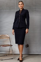 Блузка полуприлегающего силуэта выполнена из шифона «травки». Округлый вырез горловины. По переду настрочен нагрудный карман обманка листочка с 1 пуговицей. Спинка со средним швом и талевыми вытачками. Рукав втачной, одношовный на притачной манжете, застежка на 1 пуговицу и петлю . Застежка центральная 5 пуговиц и петель. Юбка с завышенной талией заужена к низу на обтачке выполнена. По переднему полотнищу юбки настрочена карман «листочка». Сзади разрез и застежка на потайную тесьму-молнию. Юбка на подкладке.