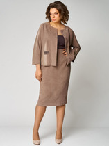 Костюм состоит из жакета и юбки. Жакет полуприлегающего силуэта, с цельнокроеным рукавом длиной 7/8. От плеча до низа рукава отделочная вставка из эко-кожи. По переду- фигурные наклонные рельефы. По правой стороне вставка из эко-кожи, настрочена нашивка контрастного цвета. Застёжка центрально-бортовая на 4 петли и 4 пуговицы. Юбка прямая, слегка зауженная к низу, на притачном поясе, по бокам с резинкой. Застёжка на 1 петлю и 1 пуговицу, и потайную молнию сзади в среднем шве, по низу шва разрез. Юбка на подкладке.