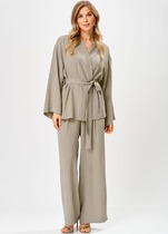 Комплект состоит из туники и юбки. Элегантный костюм не оставит Вас незамеченной и станет Вашей любимой одеждой не только на осенний период, но и в любое время года. Туника трикотажная прямого силуэта со спущенной линией плеча. По левой части переда декоративная печать. Рукав одношовный укороченный с манжетой по низу. Юбка на подкладке слегка заужена к низу, изготовлена из текстильной ткани. По переду частично отлетная правая часть с имитацией запаха. Заднее полотнище юбки со средним швом и разрезом по низу. По верху юбки притачной пояс с резинкой по бокам.