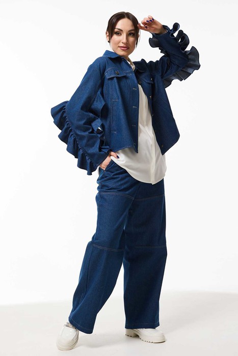 Костюм женский, двухпредметный, состоящий из жакета и брюк. Жакет с центральной застежкой на петли и пуговицы, свободного силуэта. Воротник стоячий отложной, перед с рельефом и отрезной кокеткой, в шов которой вставлен клапан. По переду обработаны прорезные карманы с листочкой. Спинка  с рельефами и отрезной кокеткой, в которую вставлена рюша, переходящая на рукав. По низу спинки - отрезная планка со шлевками. Рукав втачной, с подрезами, в которые вставлены рюшки. Брюки слегка зауженные к низу, с центральной застежкой на тесьму-молнию и пуговицы. Перед с боковыми карманамии двумя горизонтальными подрезами. Спинка с накладными карманами и одним горизонтальным подрезом выше колена.