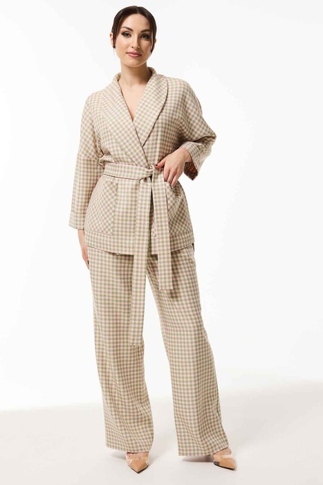 Костюм женский состоящий из жакета и брюк. Жакет без подкладки, свободного силуэта, застегивается на двубортную застежку на 2 кнопки. Воротник "шаль". Рукава цельнокройного покроя с подрезом и отворачивающимся манжетом. По переду накладные карманы. Брюки прямые, прояс на резинке, карманы в боковых швах.