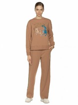 Костюм женский, состоит из блузы и брюк. Блуза прямого силуэта. Застежка центральная на 2 петли-пуговицы. воротник пиджачного типа. Блуза без карманов. Рукав внизу на пате, в боковых швах блузы - разрезы. Брюки прямые на резинке со шнурком, свободные, прямые, с боковыми карманами. Дополняет костюм съемный пояс.
