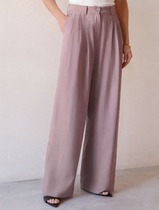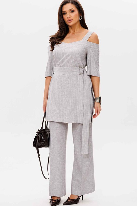 Костюм женский, состоящий из блузы и брюк. Блуза прямого силуэта, с разрезами по бокам. Рукав втачной, до линии локтя. Блуза на широких бретелях в области белья. Горловина V-образная с притачной планкой по линии переда, спинки и рукава. Блуза с поясом под пряжку. Брюки по силуэту с легким клешем от колена, по низу отделочная широкая подгибка. Карманы боковые накладные. Брюки с застежкой на молнию. Притачной пояс застегивается на петлю-пуговицу и с резинками по бокам. Модель без подкладки.