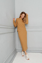 Костюм женский состоит из жакета и юбки. Жакет прямого силуэта, с центральной застежкой на пришивные кнопки. Перед с нагрудными вытачками и прорезными карманами с листочкой. Спинка со средним швом, заканчивающимся шлицей. Рукав втачкой, одношовный, до локтя. Жакет без подкладки. Юбка расклешенная к низу. Застежка на потайную молнию в боковом шве. Верх юбки обработан обтачкой и шлевками. Дополнение к костюму - узкий пояс.