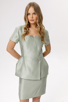 Костюм женский, состоящий из жилета и брюк. Жилет полуприлегающего силуэта, без подкладки. Плечо спущенное.Вырез V - образный, с воротником стойкой. по переду иммитация карманов с клапаном. Центральная застежка на пришивные кнопки. Спинка со средним швом и вытачками. Брюки прямого силуэта, слегка зауженные к низу. Пояс частично на резинке (по бокам), с шлевками для ремня. Застежка на гульфик с молнией и внутренним крючком. По бокам боковые карманы с косым входом, сзади декоративные прорезные карманы «в рамку». Материал костюма костюмный, средней плотности, с гладкой фактурой. Без подкладки. Дополняет модель широкий пояс.